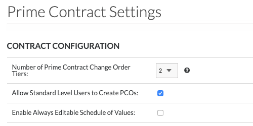 Mark this checkbox to provide users with editing permissions the ability to add, update and remove line items from the SOV when the contract is in any status. Clear the mark to restrict users from editing the schedule of values. This setting is turned OFF by default. To learn more, see What is the 'Enable Always Editable Schedule of Values' setting?